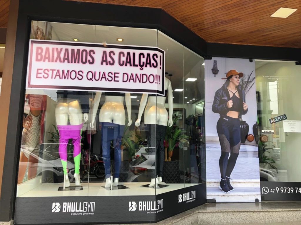 Uma loja no centro de Brusque fez um ‘merchan’ diferente para atrair clientes. A propaganda foi colocada no local há menos de uma semana e atrai olhares de quem passa por ali, e também viralizou nas redes sociais.