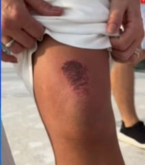 Não foi pouca coisa. Juliana mostrou as marcas do acidente: inchaço na panturrilha, ferimentos na cabeça, braço, ombro, costas e joelhos, com maior gravidade em um dos joelhos.