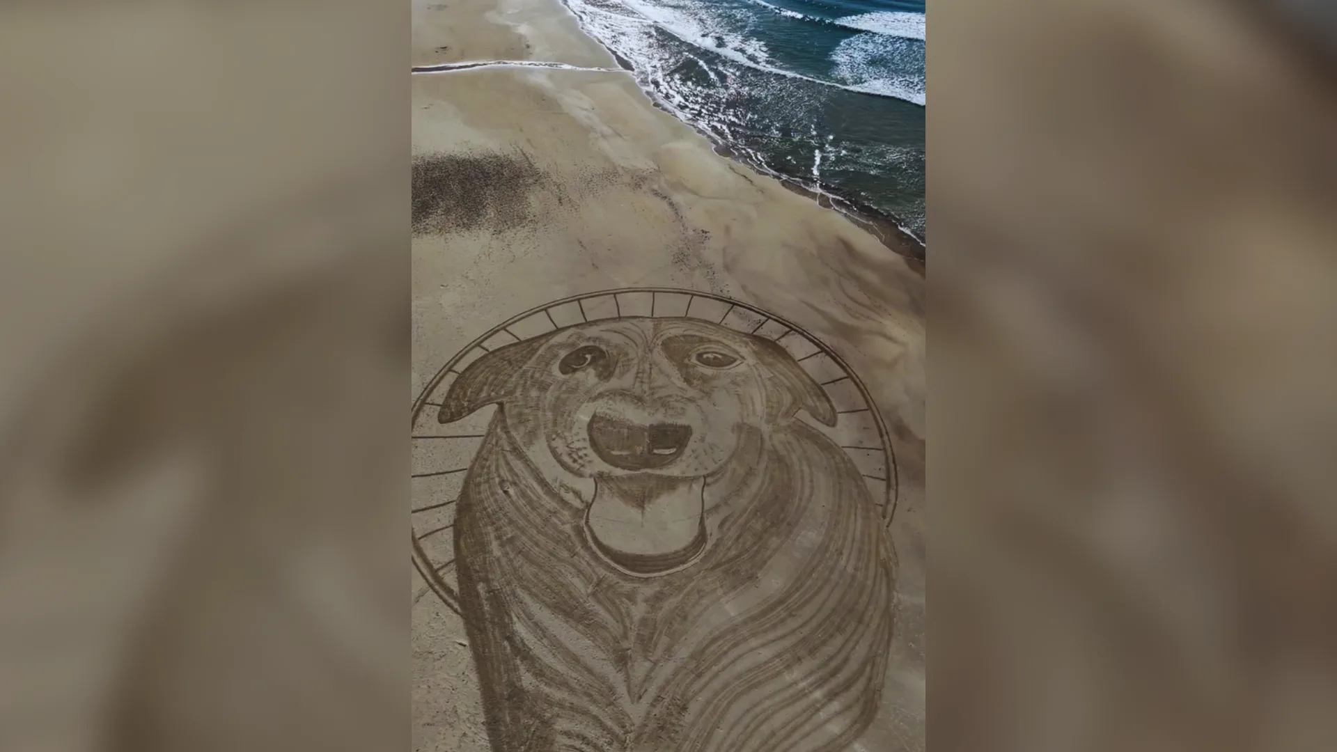 Artista cria desenho na areia em homenagem ao cão Orelha em praia de SC
