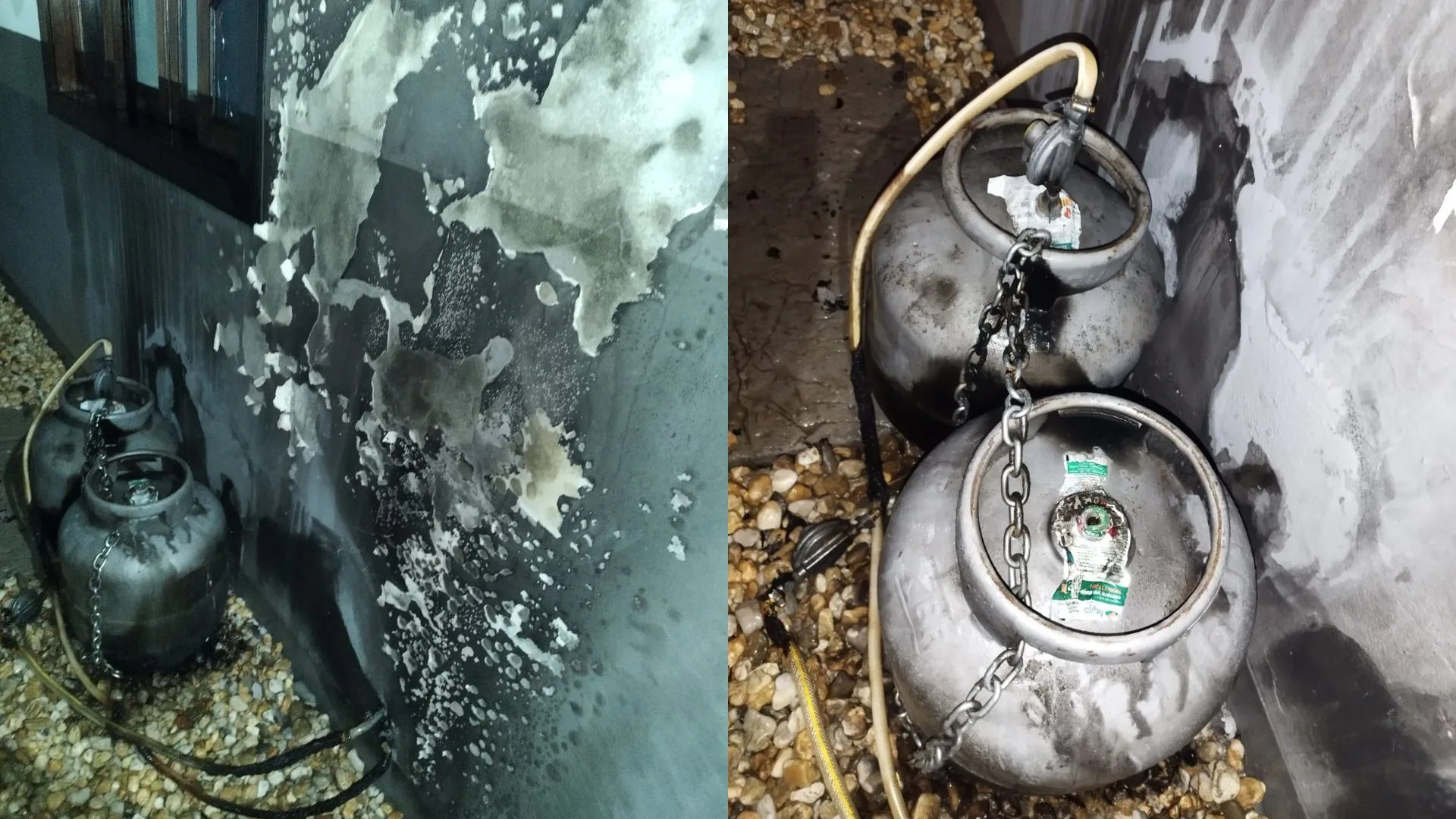 Quando chegaram ao local, os bombeiros encontraram um botijão de gás GLP em chamas na área externa da residência, onde estavam armazenados três recipientes.