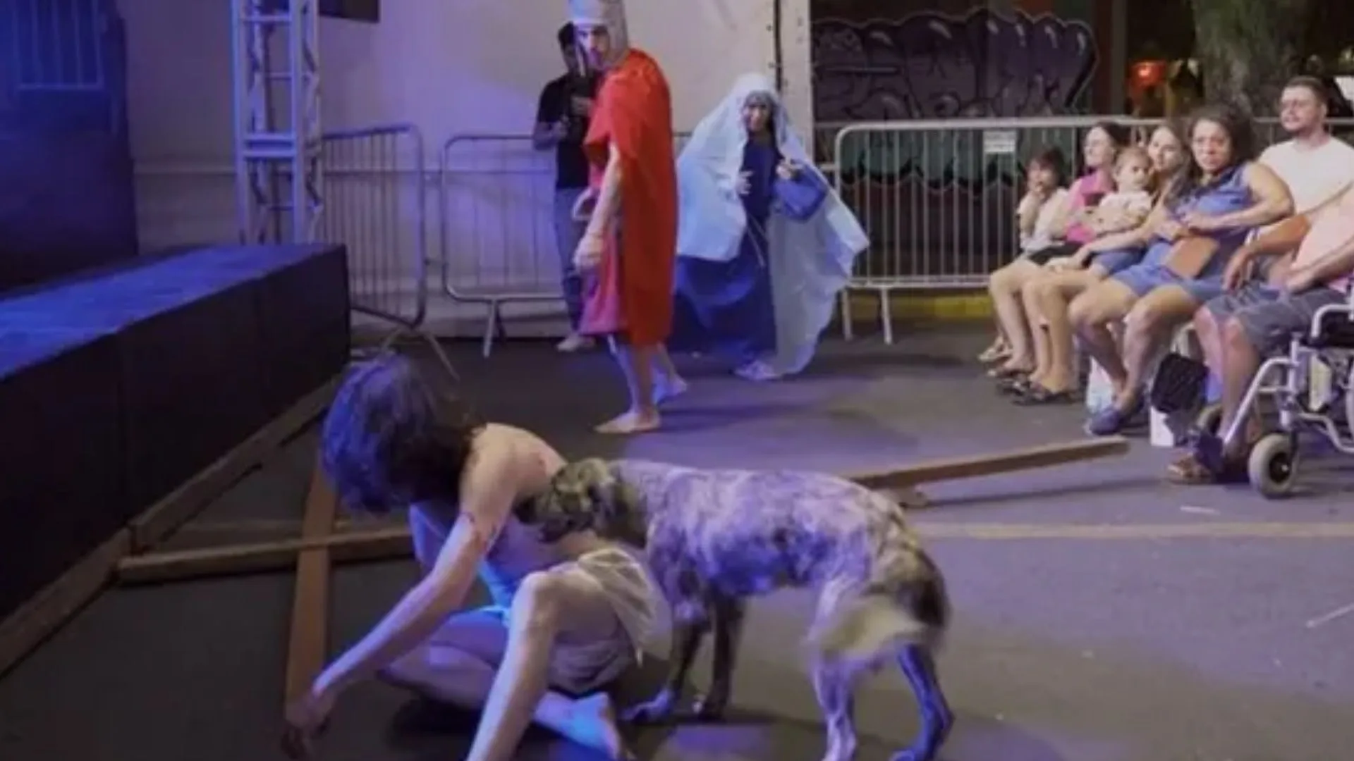 Cachorrinha invade palco e “protege” Jesus durante encenação da Paixão de Cristo