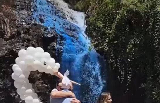 Chá revelação deixa cachoeira azul com corante e casal recebe críticas; veja