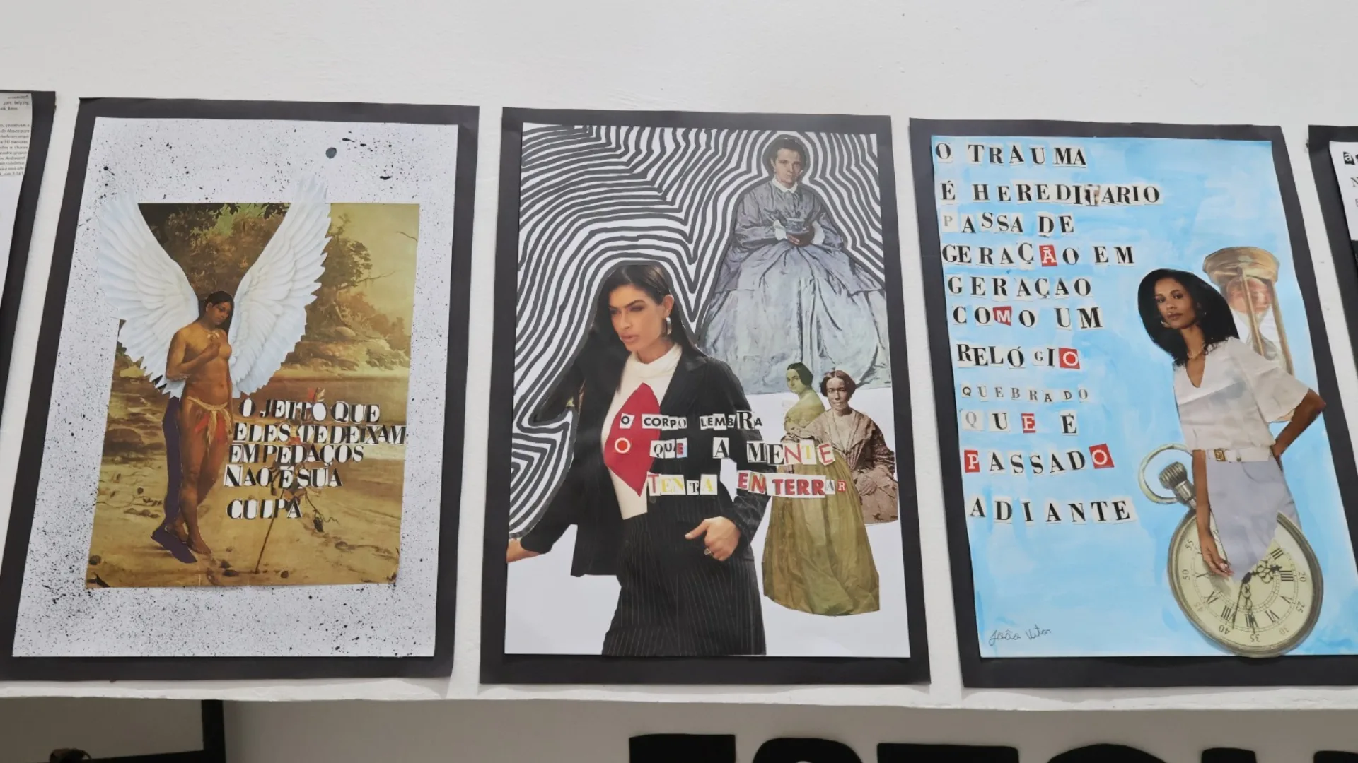 Além das pinturas, alguns alunos produziram colagens inspiradas em textos da poetisa canadense Rupi Kaur. Nas obras, palavras e imagens se sobrepõem em fragmentos que remetem a memórias e sentimentos interrompidos pela violência.