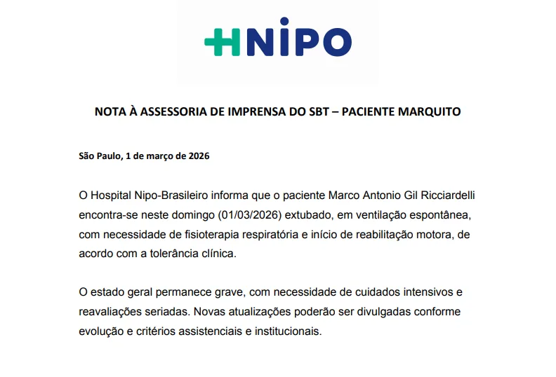 Apesar da evolução, o estado geral permanece grave, com necessidade de cuidados intensivos e reavaliações frequentes. O hospital informou que novas atualizações poderão ser divulgadas conforme a evolução do quadro clínico.
