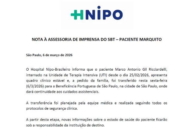 Marquito estava internado na Unidade de Terapia Intensiva (UTI) do Hospital Nipo-Brasileiro desde 25 de fevereiro. Segundo o comunicado, ele apresentava quadro clínico estável e, a pedido da família, a transferência foi realizada seguindo todos os protocolos de segurança clínica.