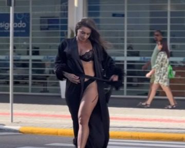 Em um vídeo, a modelo aparece desfilando na faixa de segurança com um robe e lingerie em renda