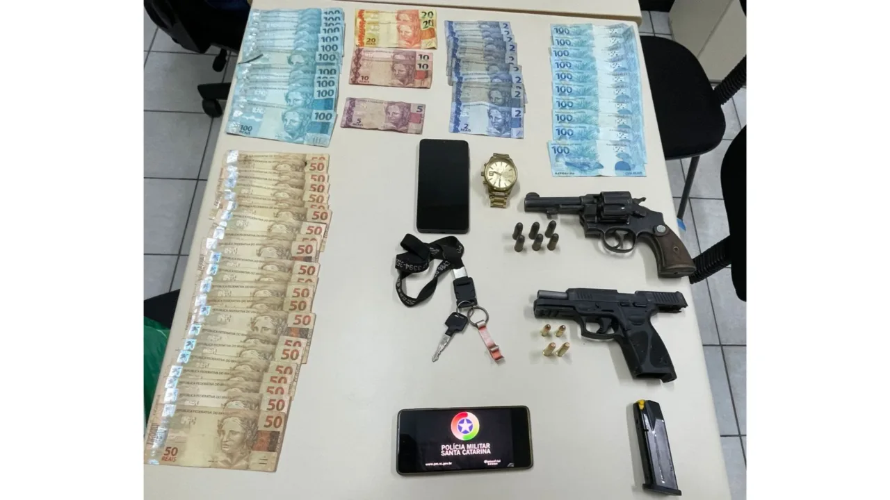 Com eles, os policiais apreenderam um revólver calibre .45 com seis munições, uma pistola Taurus G3 com duas munições, além de dinheiro e um celular.