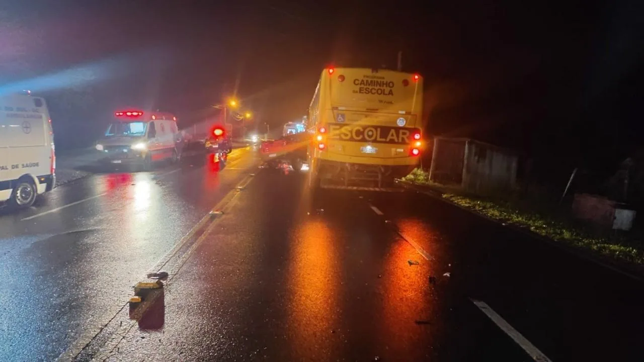Grave acidente entre ônibus escolar e caminhonete deixa mulher morta em SC