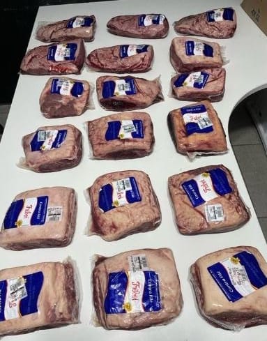 Já do lado de fora do estabelecimento, o suspeito foi abordado e a caixa de papelão foi aberta, verificando que haviam 18 peças de carne à vácuo, que juntas somam a quantia de R$ 1.337,07.