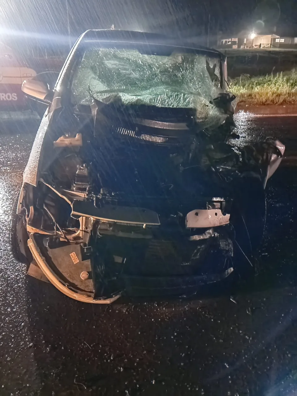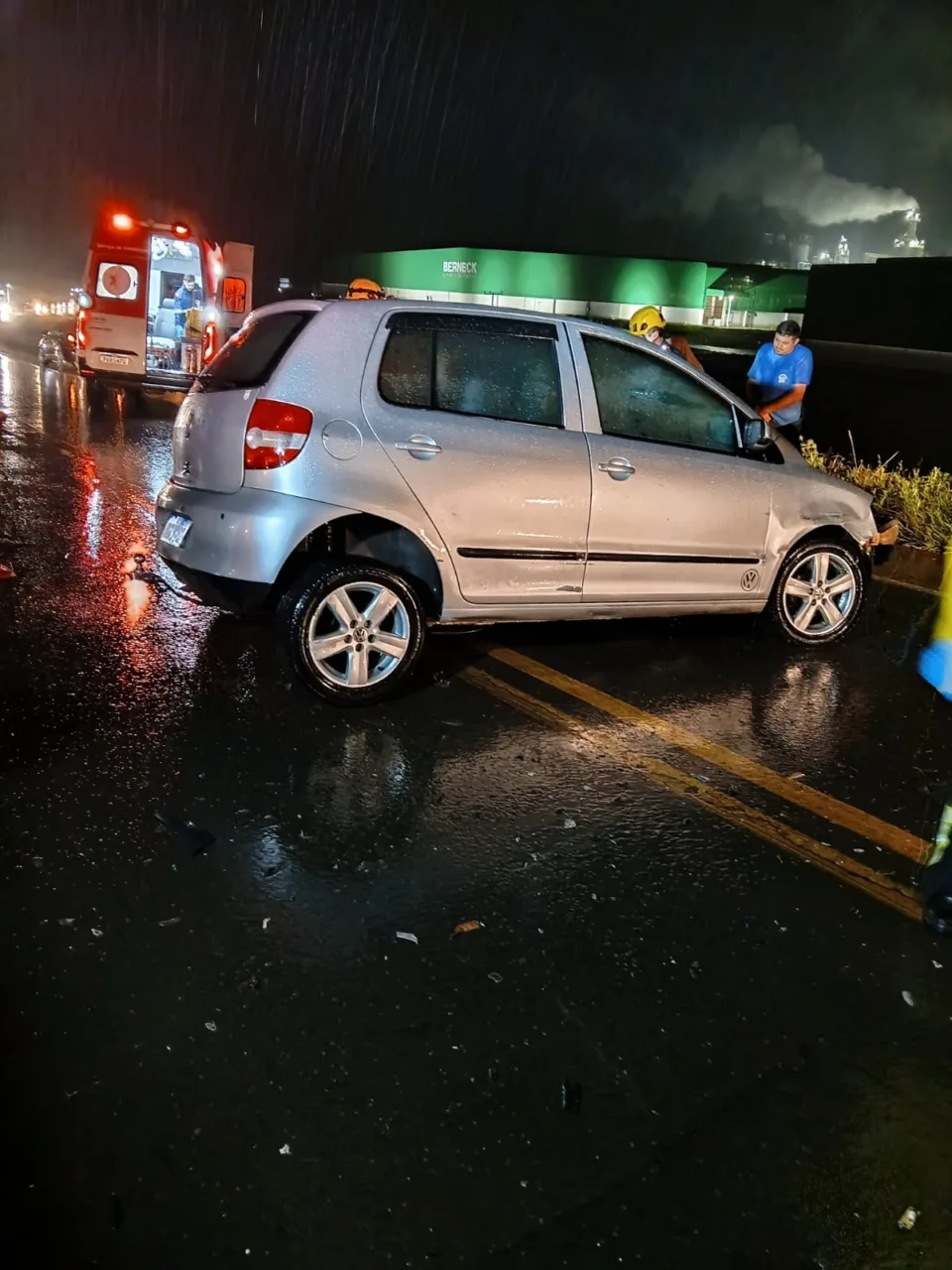 O motorista de um Volkswagen Fox, um homem de 45 anos, foi encontrado inconsciente e preso às ferragens pelas pernas. As equipes realizaram o trabalho de desencarceramento para retirar a vítima do veículo.