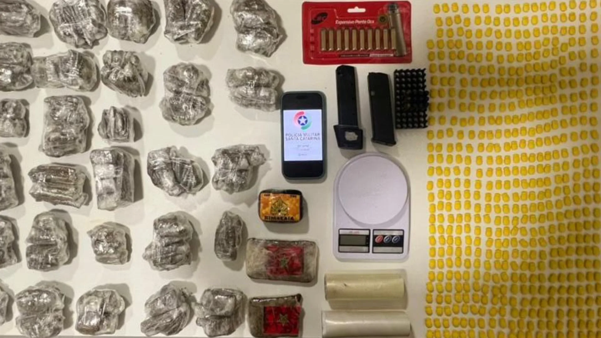 Os policiais aprenderam aproximadamente 1.751g de maconha, 167g de haxixe, 795 comprimidos de ecstasy, 99g de ice, além de 144 buchas de cocaína. Também foram localizados dois rolos de filme plástico, 10 munições calibre .357, 12 munições calibre 9mm, uma balança de precisão e um tubo utilizado para armazenamento do material.