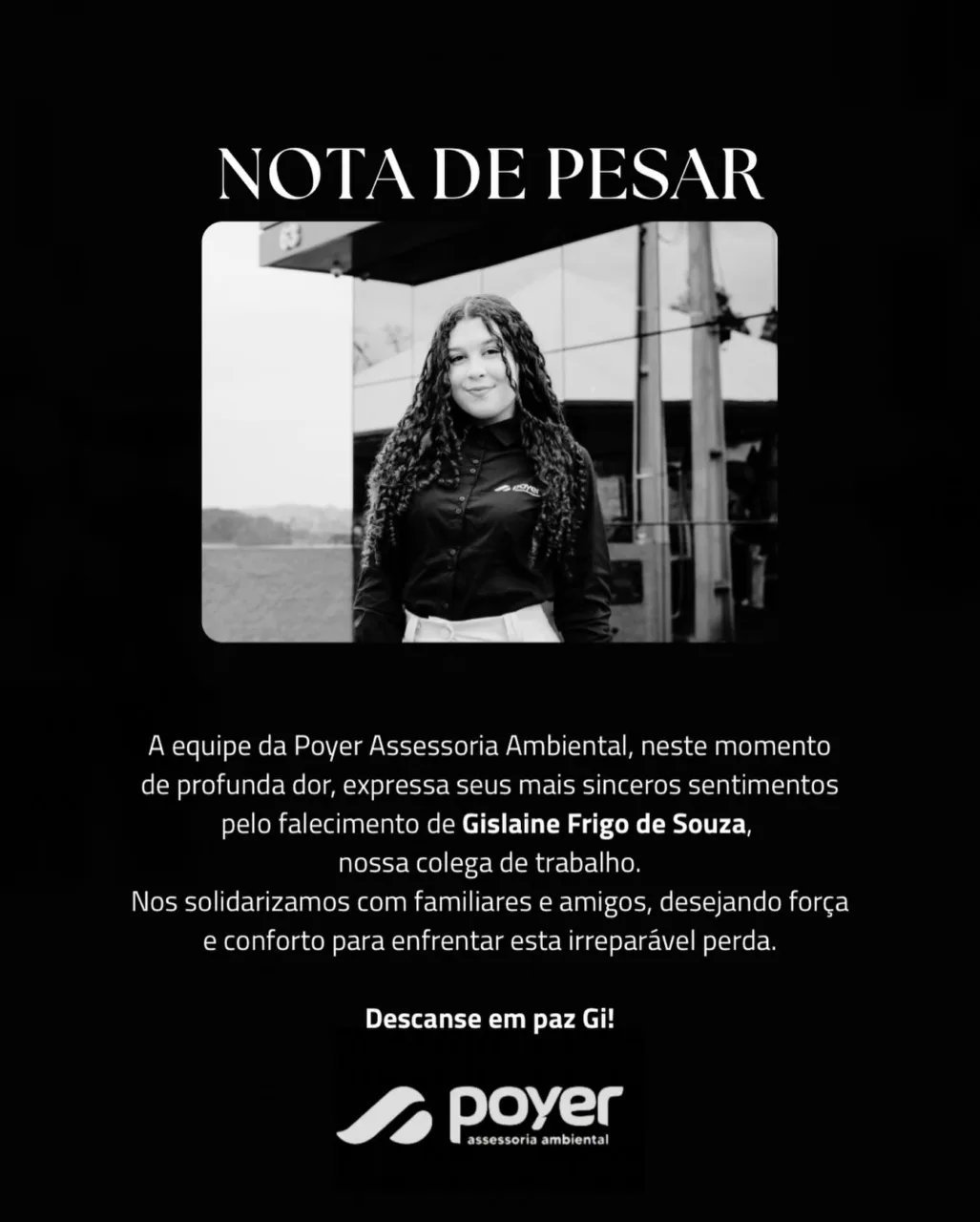 A equipe da Poyer Assessoria Ambiental manifesta sua profunda solidariedade aos familiares e amigos neste momento de dor. Que as boas lembranças, o carinho e o legado deixado por Gislaine sejam conforto para todos.