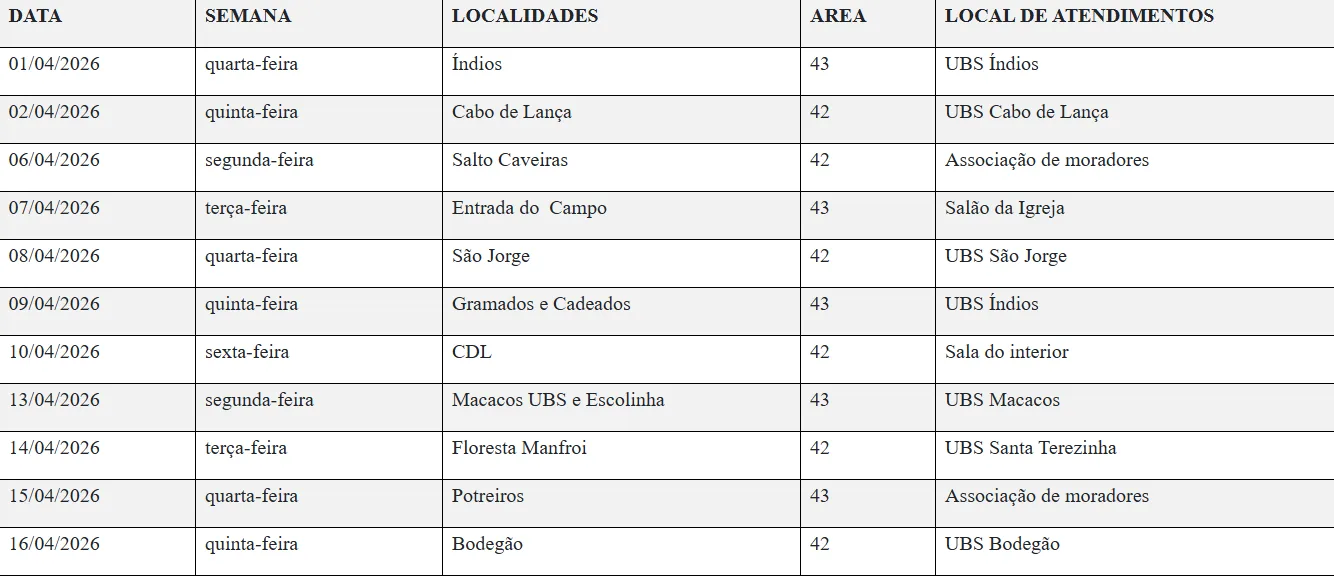 As atividades estão programadas para ocorrer entre os dias 1º e 30 de abril. De acordo com a pasta, a estratégia visa otimizar o fluxo de pacientes e organizar a atuação das equipes técnicas em campo. Cada localidade terá um ponto de referência específico para os atendimentos, conforme o planejamento logístico estabelecido pela gestão municipal.