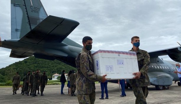 As vacinas chegaram ainda pela manhã de segunda-feira na Base Aérea de Florianópolis (BAF) e, por volta das 14h, deram entrada no Centro de Distribuição da SES.
