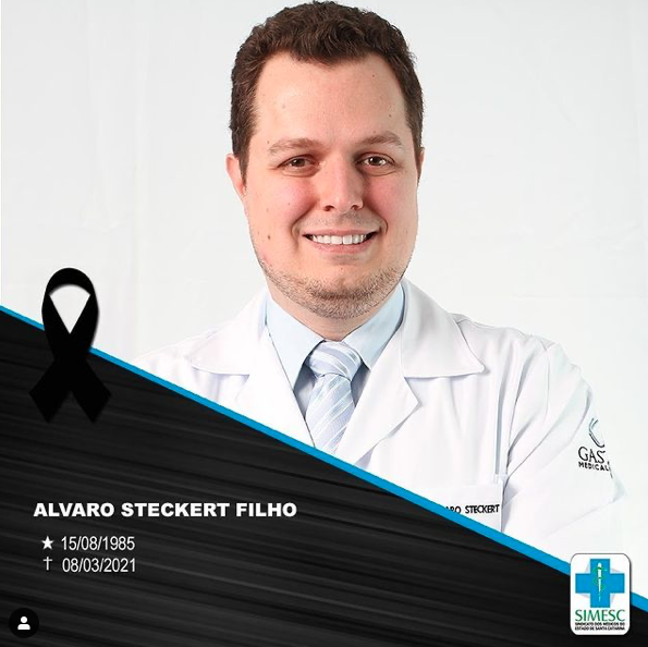 De acordo com o Sindicato dos Médicos do Estado de Santa Catarina (SIMESC), Alvaro Steckert Filho é o 24º médico vítima de Covid-19 em Santa Catarina.