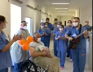 Após longos e difíceis dias na UTI Covid, pacientes internados no Hospital e Maternidade Tereza Ramos de Lages recebem alta da UTI com música e animação.