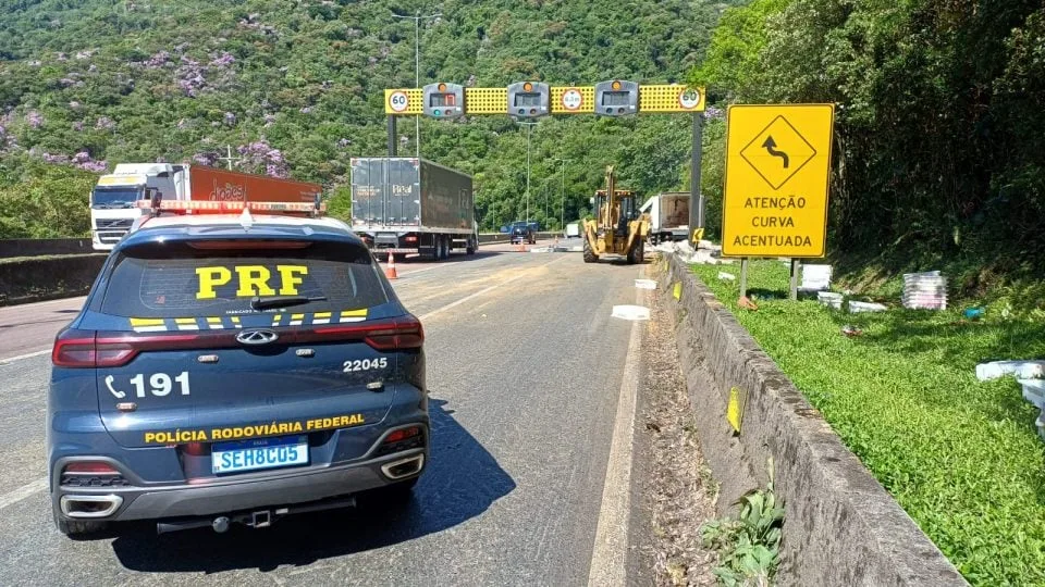 Segundo a Polícia Rodoviária Federal (PRF), aconteceu uma colisão traseira entre dois caminhões na pista sentido Santa Catarina. Os veículos envolvidos transportavam carga de peixes, que ficou espalhada pela rodovia após a colisão.