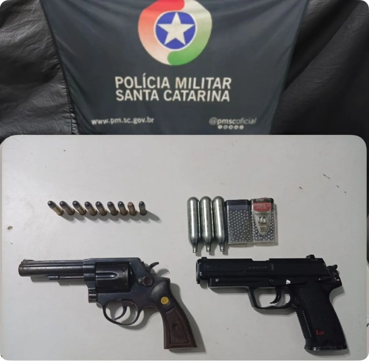 Durante as buscas nos veículos utilizados pelo grupo, os policiais localizaram um revólver calibre .38, com nove munições intactas. O responsável pelo automóvel assumiu a posse da arma e informou não possuir autorização legal. Em outro veículo, foi apreendido um simulacro de arma de fogo do tipo airsoft, além de acessórios.