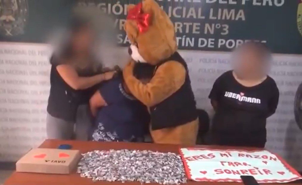 A prisão ocorreu no distrito de San Martín de Porres, um dos agentes usou a fantasia de urso para capturar uma traficante de drogas. O policial aparece com uma placa romântica na frente da casa da suspeita.