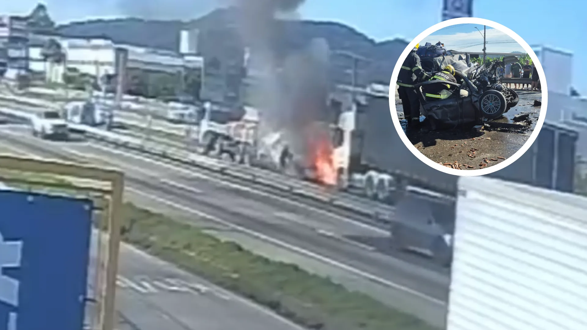 Uma câmera de segurança registrou o acidente que matou três pessoas da mesma família na manhã desta terça-feira (18), na BR-101, em Itajaí. A colisão envolveu uma carreta, uma Kombi, um carro de passeio e um caminhão carregado de tijolos.