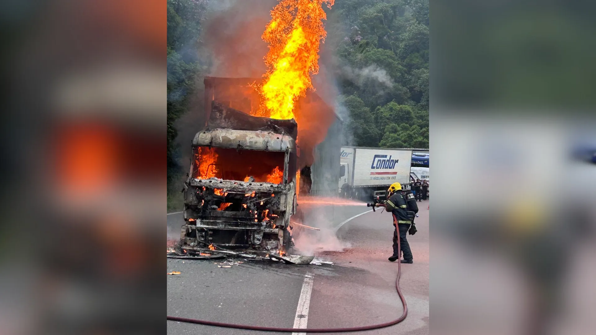 Um caminhão carregado com cerveja pegou fogo na manhã desta quarta-feira (21), na BR-376, em Guaratuba, no Paraná. O incêndio provocou a interdição das pistas no sentido Santa Catarina.