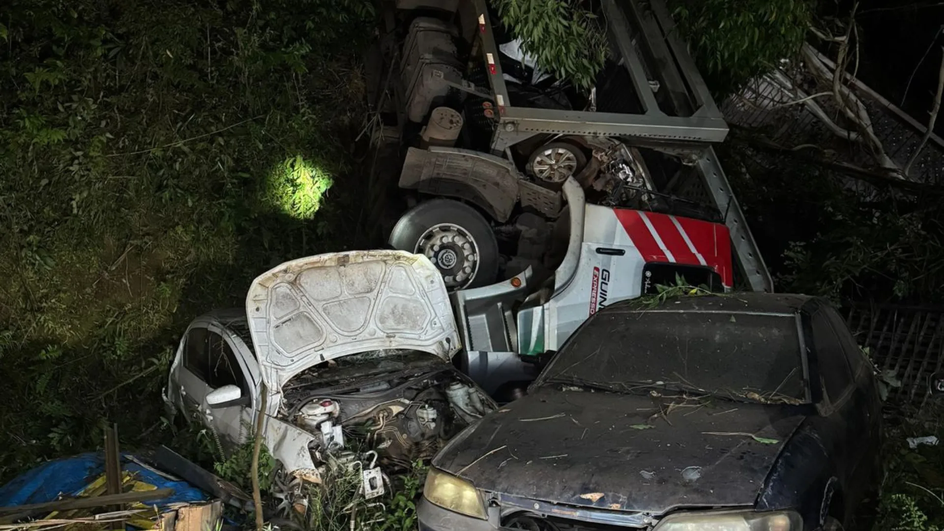 No local, as equipes do Corpo de Bombeiros (CBMSC), confirmaram que o caminhão-cegonha saiu da pista e atingiu uma oficina mecânica, além de colidir contra alguns veículos que estavam estacionados. O condutor do caminhão foi encontrado consciente e orientado, fora da cabine, sobre o capô de outro veículo. Ele estava com o membro inferior esquerdo preso entre esse veículo e a cabine do caminhão.