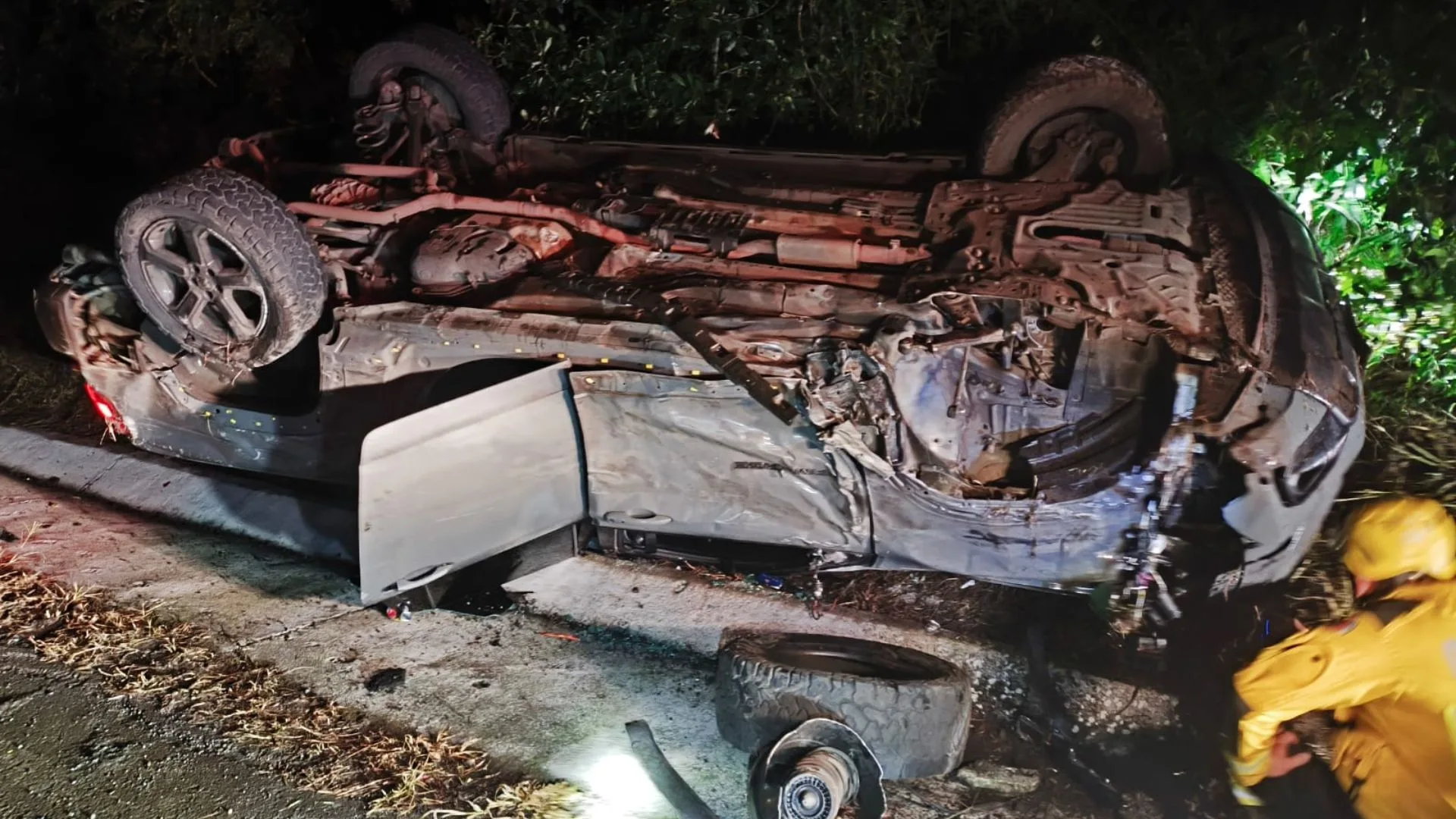 Ao chegarem ao local, os socorristas confirmaram que a caminhonete havia capotado após o impacto com o veículo de carga. Apesar da gravidade visual da cena, a condutora da caminhonete já se encontrava fora do veículo quando a ajuda chegou.
