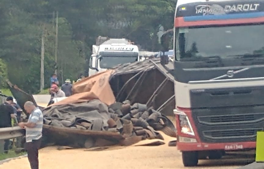 O tombamento de uma carreta carregada de milho está bloqueando o trânsito sentido sul da BR-101, no Morro dos Cavalos, em Palhoça, na manhã desta sexta-feira (8). O trânsito sentido sul estava bloqueado temporariamente para retirada da carga de milho que caiu sobre a via, mas no começo da tarde, por volta das 15h24min, a via foi liberada.
