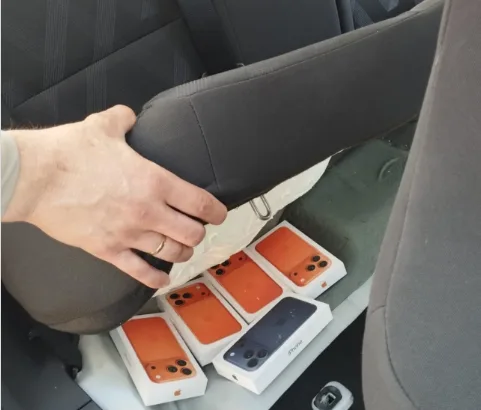 Durante a vistoria nas bagagens, os policiais encontraram compartimentos ocultos em malas de mão, onde estavam escondidos aparelhos celulares. Em uma busca mais detalhada no interior do veículo, outros smartphones foram localizados sob o banco traseiro.