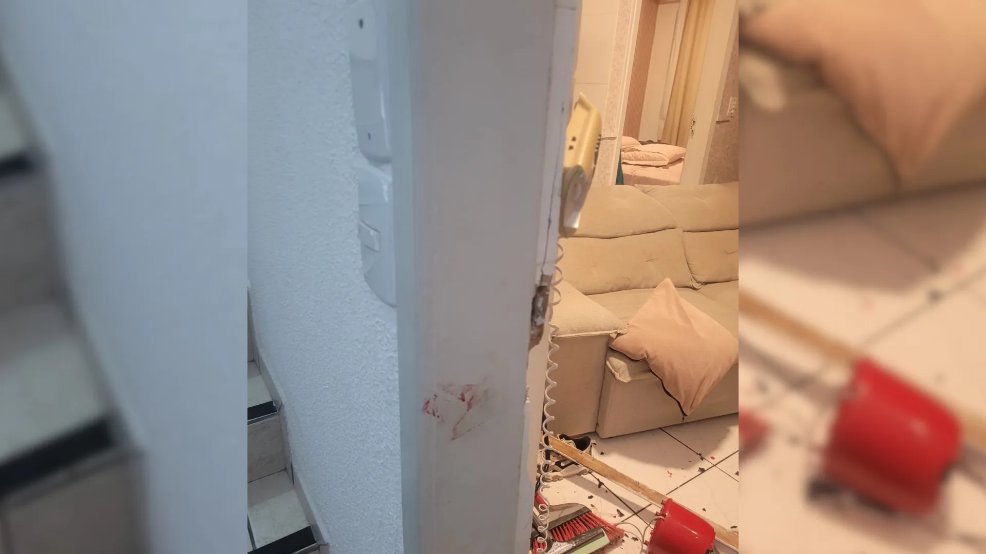 Ao entrarem no local, os policiais viram sinais de arrombamento e danos nas áreas comuns do prédio. O suspeito havia invadido um apartamento e a moradora do imóvel estava trancada em um quarto, enquanto ele a ameaçava, afirmando que iria matá-la, com uma faca.