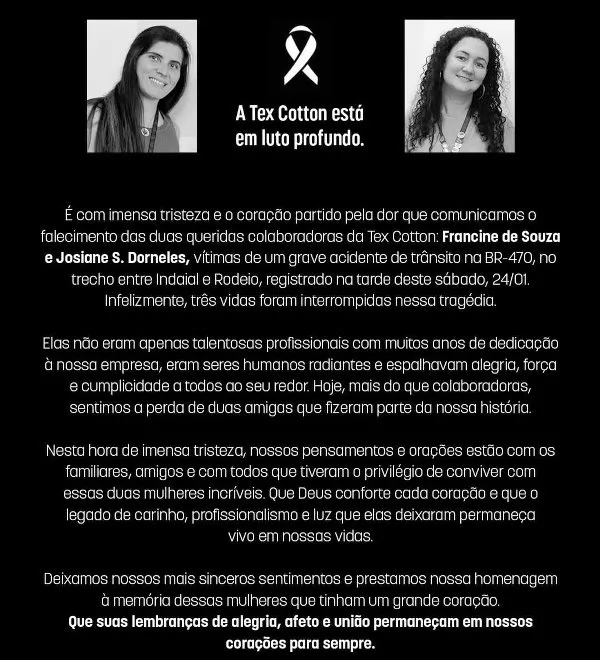 Josiane e Francine trabalhavam juntas na empresa Tex Cotton, de Blumenau, que manifestou seu pesar em nota oficial nas redes sociais.
