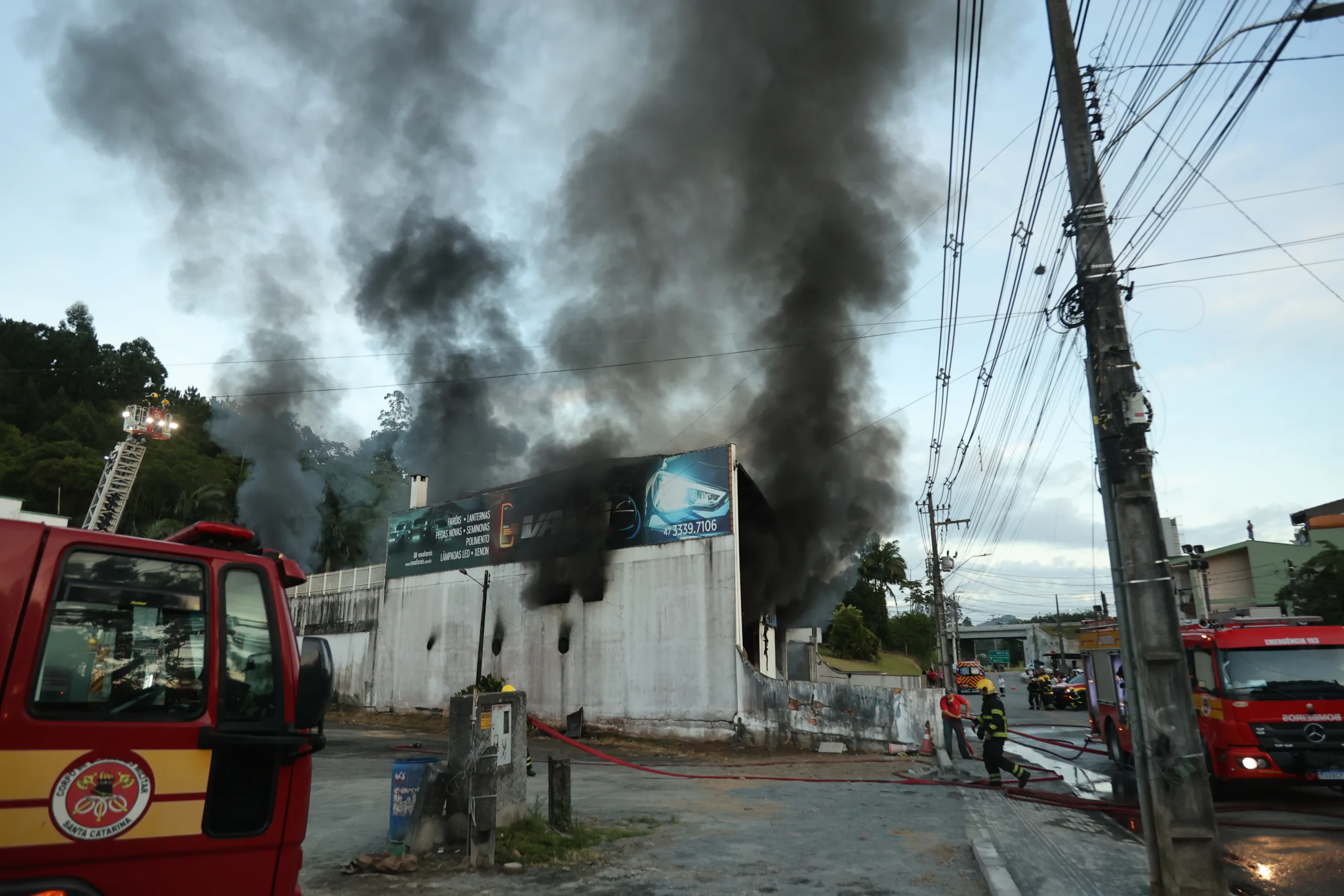 Um incêndio atingiu uma revenda de autopeças no térreo em um prédio de dois andares na manhã desta sexta-feira (6), no bairro Fortaleza, em Blumenau, no Vale do Itajaí.