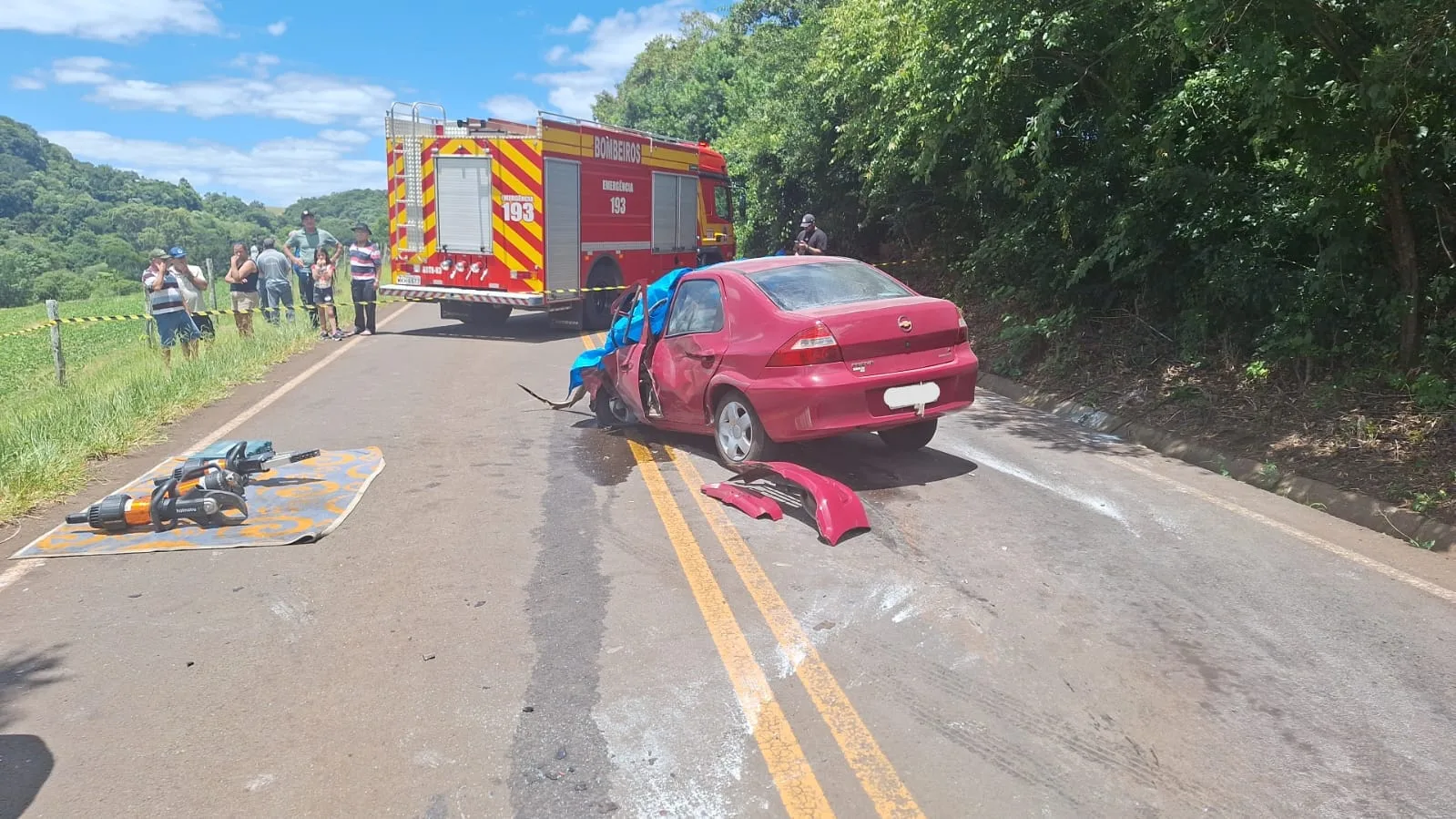 No local, as equipes da Polícia Militar Rodoviária (PMRv) constataram o acidente envolvendo uma motocicleta Honda CG 150, com placas de Galvão, um Chevrolet Prisma, emplacado no mesmo município, e um Hyundai Tucson, de Xanxerê.