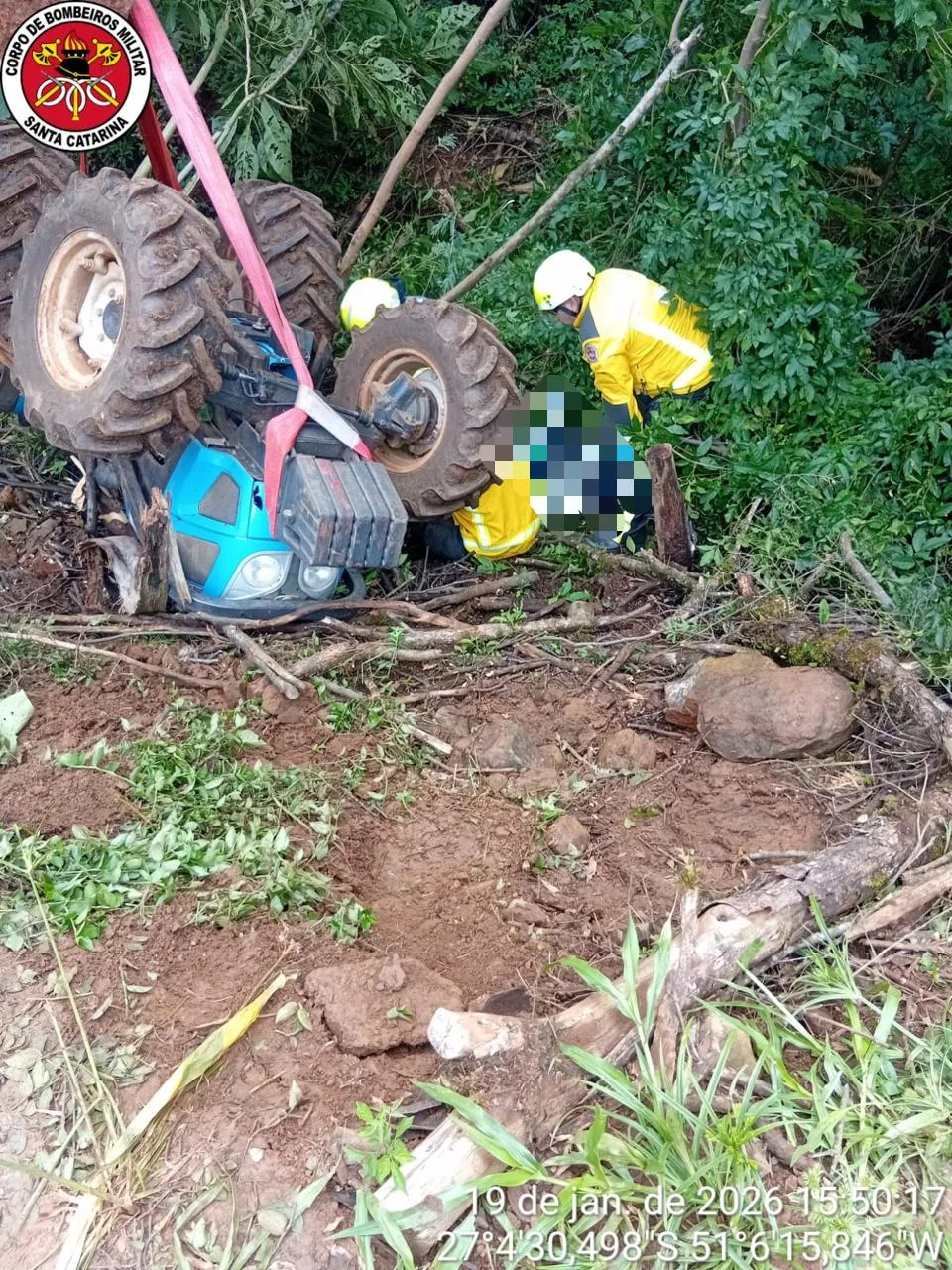 Uma mulher de 49 anos morreu após o trator agrícola que conduzia sair da pista e capotar em um barranco, na tarde desta segunda-feira (19), por volta das 13h58, no interior do município de Videira, no Meio-Oeste de Santa Catarina. Com o impacto, a vítima ficou presa sob o veículo.