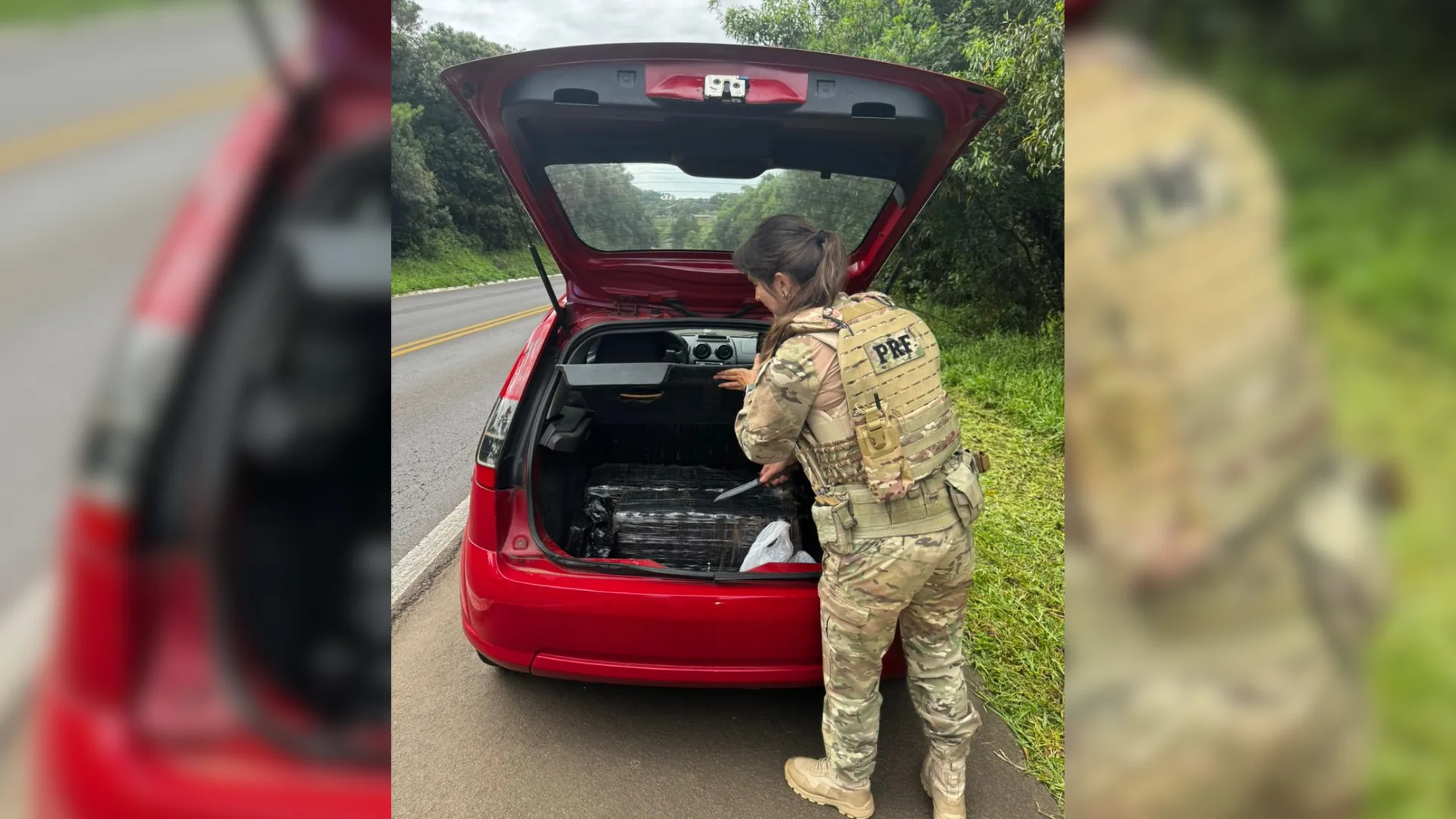 Durante a operação, os policiais pararam um veículo Ford Fiesta com placas de Laranjeiras do Sul, no Paraná. Na vistoria, os agentes localizaram um fardo de maconha envolto em plástico preto atrás do banco do motorista.