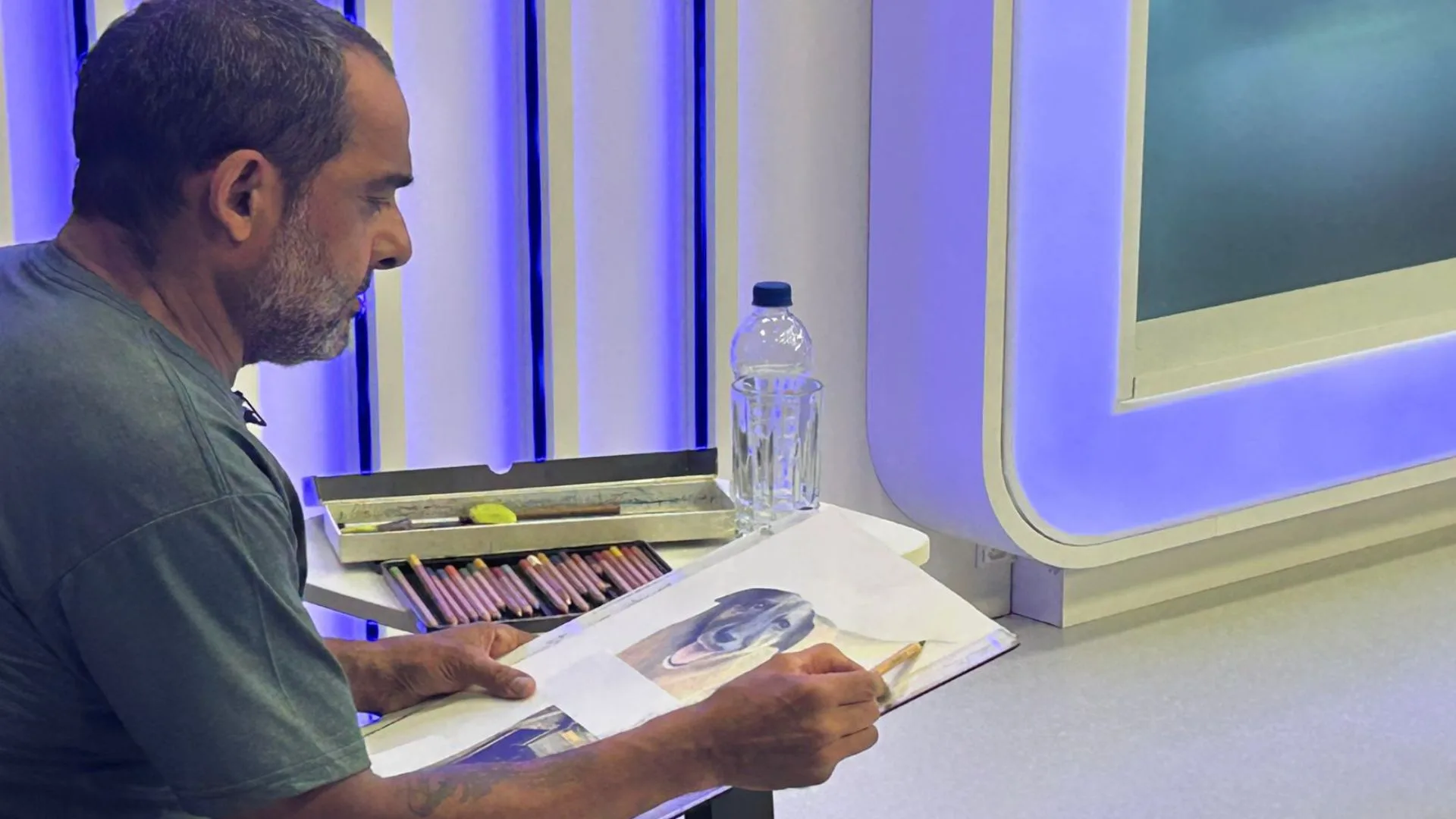 O professor, artista e desenhista Marshall, natural de Santa Maria (RS) e morador de Florianópolis há mais de 15 anos, participou nesta quarta-feira (28) do Jornal do SCC SBT, Tá Na Hora Santa Catarina, para prestar uma homenagem em forma de desenho ao cão Orelha, vítima de maus-tratos na Praia Brava, no Norte da Ilha.