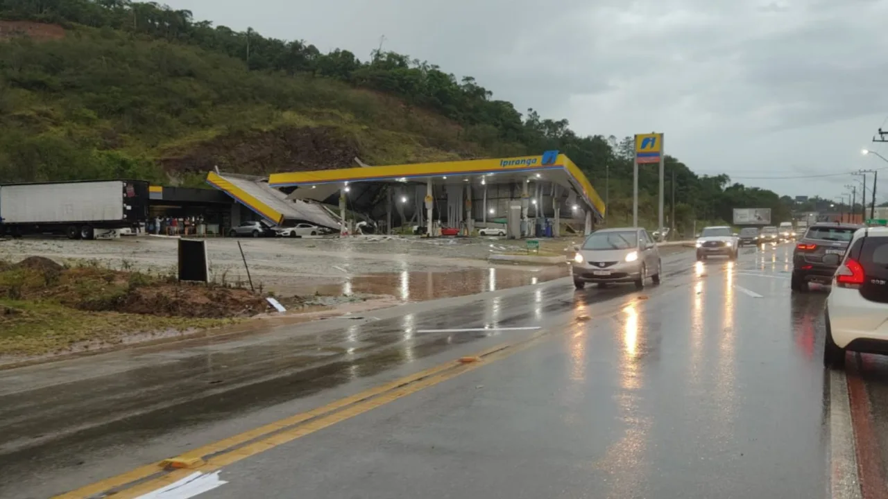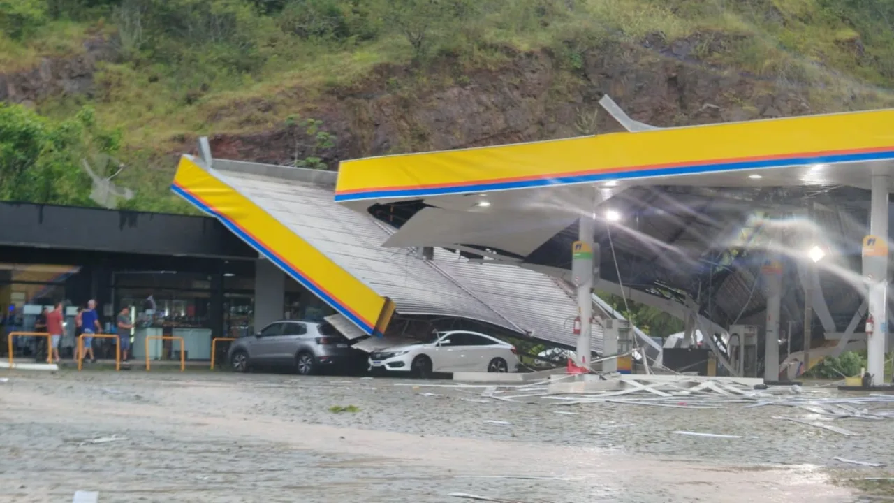 Temporal derruba a estrutura de um posto de combustíveis no bairro Bela Vista, em Gaspar; teto atingiu carros e não há confirmação de feridos