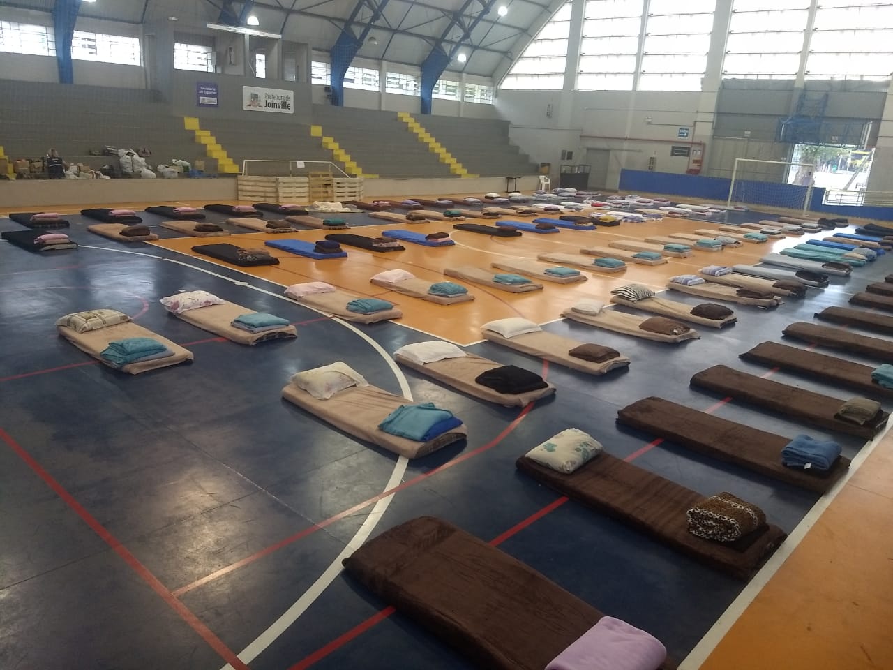 Desde às 8h desta terça-feira, servidores da Prefeitura de Joinville estão no ginásio para receber doações como roupas (principalmente as masculinas), travesseiros, colchões e cobertores.