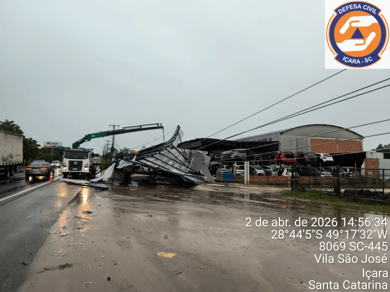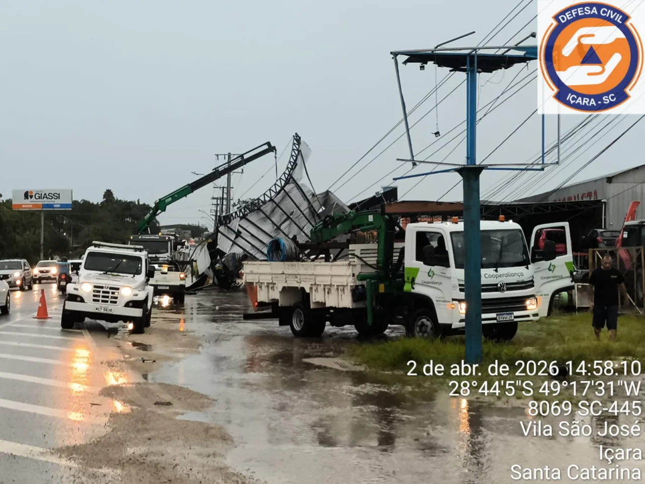 Na tarde desta quinta-feira (2), uma tempestade com ventos fortes atingiu os municípios de Treze de Maio e Içara, causando danos e mobilizando equipes da Defesa Civil.