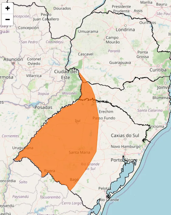 A previsão indica chuva intensa, com acumulados entre 30 e 60 mm por hora ou 50 a 100 mm por dia, além de ventos fortes entre 60 e 100 km/h e possibilidade de queda de granizo.