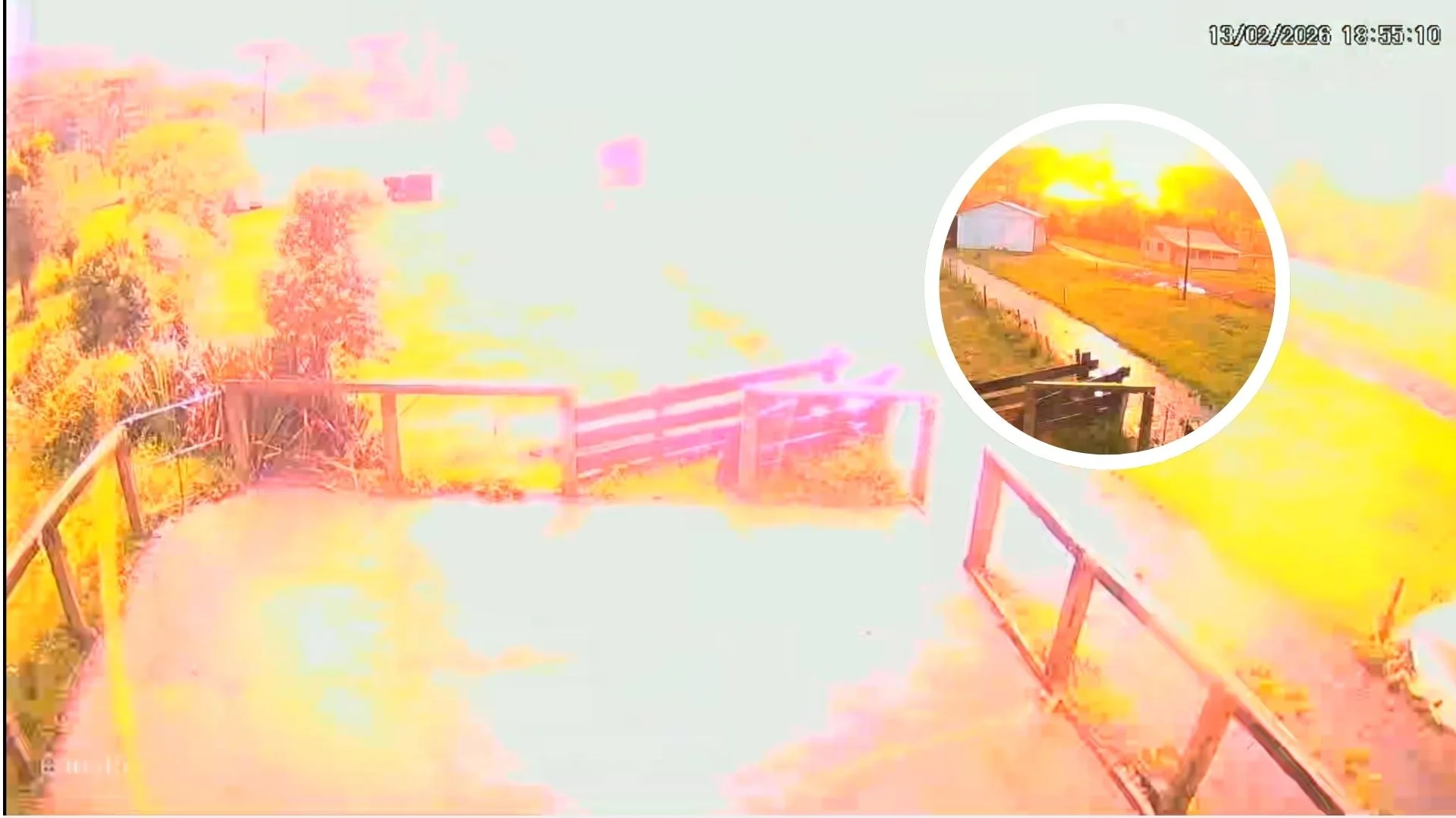 As imagens captadas pelo sistema de monitoramento mostram o instante em que o clarão atinge a cerca elétrica. Logo após a descarga, é possível observar o início das chamas no terreno da propriedade.