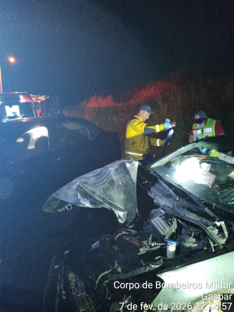 De acordo com o Corpo de Bombeiros Militar de Gaspar (CBMSC), a ocorrência envolveu um Volkswagen Voyage e um Renault Logan. Com o impacto da colisão, ambos os veículos acabaram caindo em uma ribanceira de aproximadamente cinco metros de altura, parando em uma via paralela à rodovia federal.