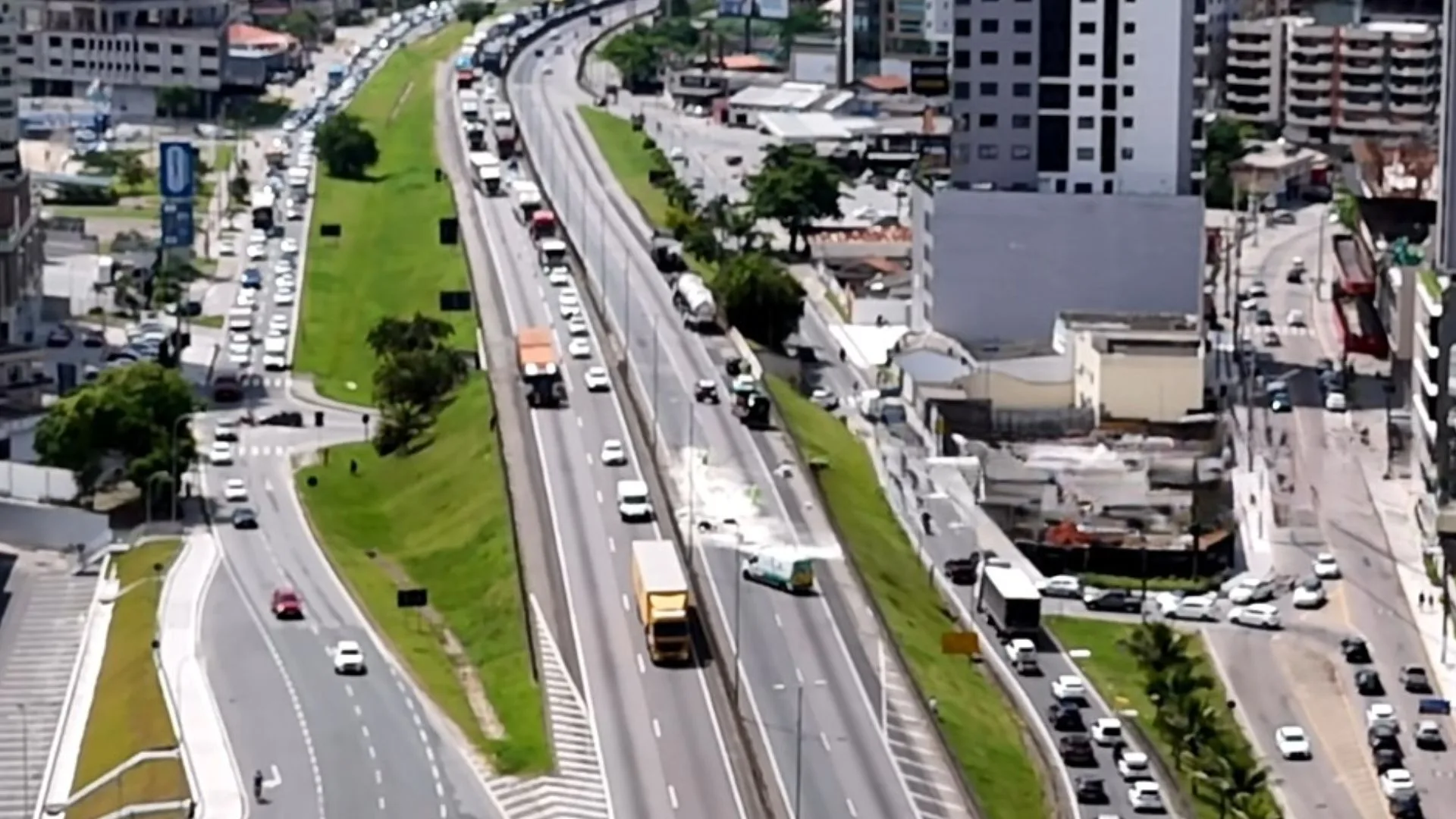 No sentido Norte, a rodovia está completamente interditada, e os motoristas estão sendo desviados pela via marginal. A orientação da PRF é, se possível, evitar o trecho até a normalização do fluxo.