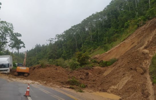 Deslizamento atinge caminhão na BR-280 e rodovia é interditada em Corupá