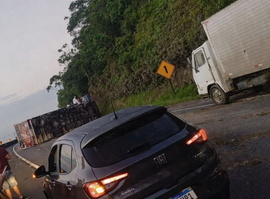 Caminhão tomba e bloqueia a BR-101 em Biguaçu