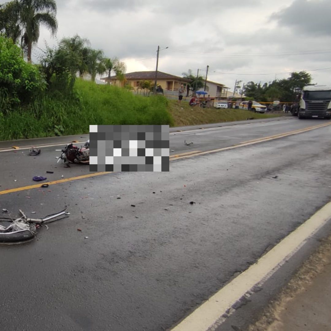 Grave acidente entre moto e caminhão deixa duas vítimas fatais na SC-108