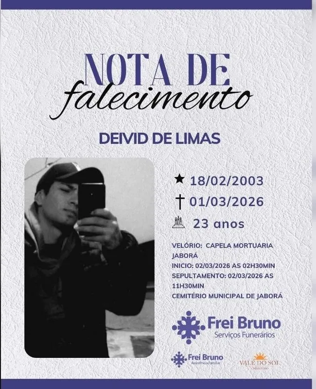 O velório ocorre na capela mortuária do município, e o sepultamento está marcado para as 11h30, no cemitério de Jaborá, em meio à dor e à comoção de familiares e amigos.