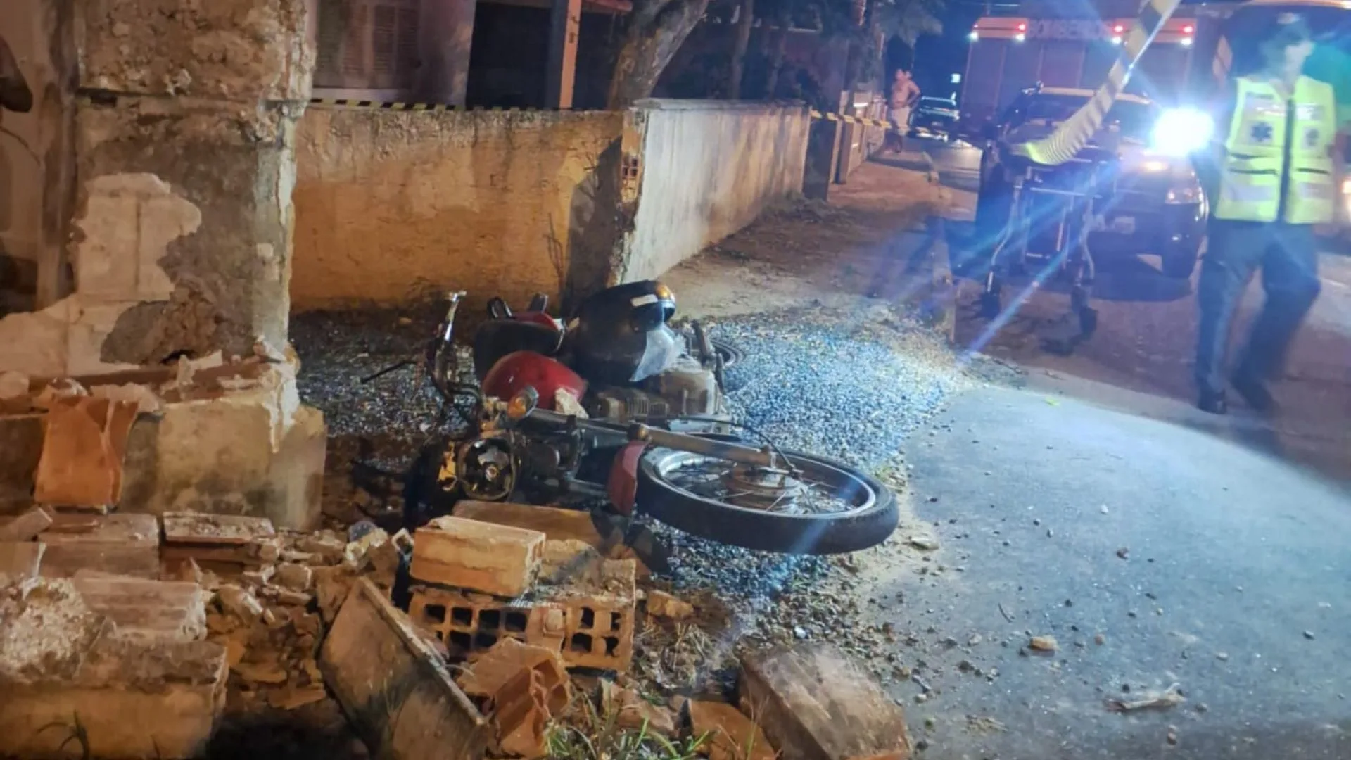 Com o impacto, ele foi arremessado por cima de um muro e caiu dentro de uma propriedade privada, a cerca de quatro metros de distância da moto.