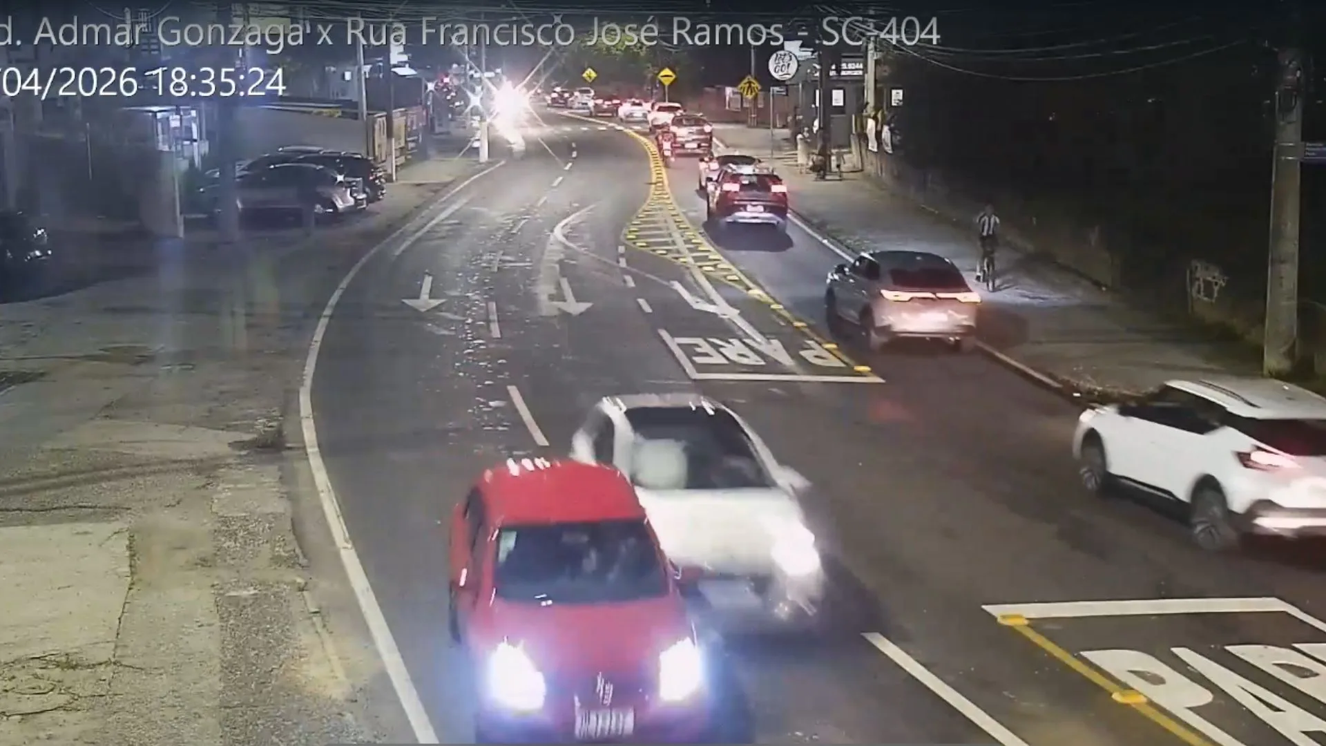Um acidente de trânsito deixou duas pessoas feridas na noite deste sábado (11) na SC-404, no bairro Itacorubi, em Florianópolis. De acordo com a Polícia Militar de Santa Catarina, a colisão ocorreu por volta das 18h40, no km 1,150 da rodovia, no sentido Lagoa-Centro, envolvendo três veículos.