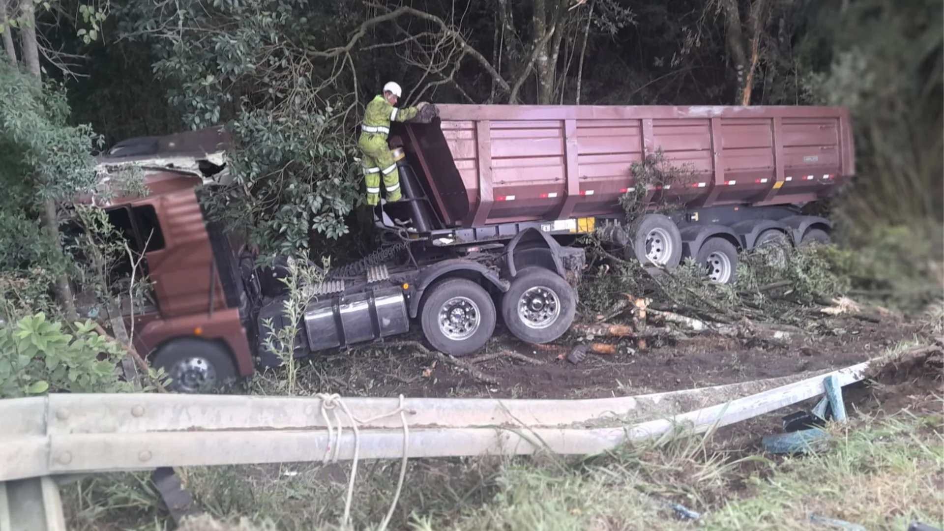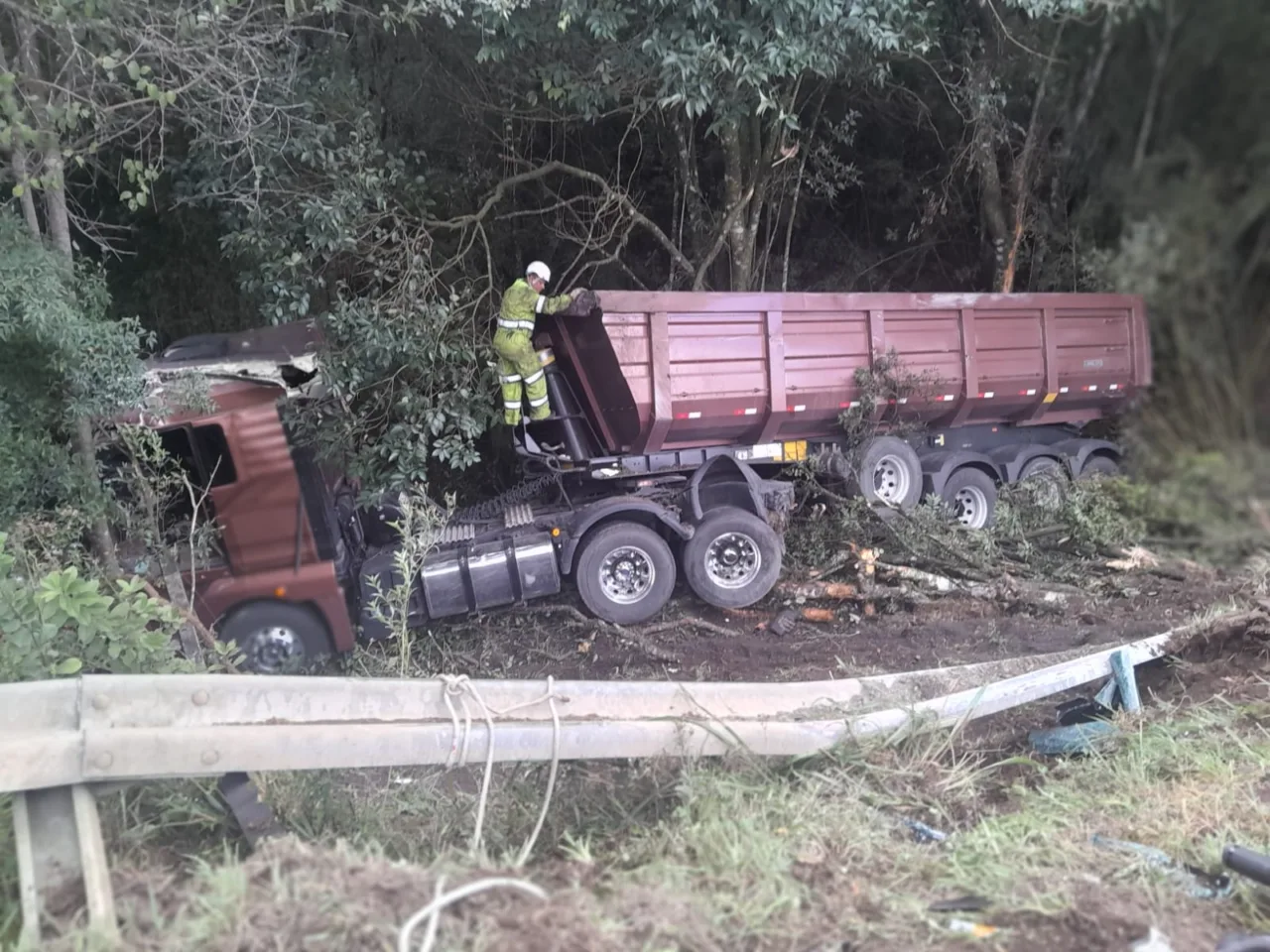 Um motorista precisou ser resgatado das ferragens na tarde desta segunda-feira (6) após seu caminhão cair em uma ribanceira de cerca de seis metros, na BR-116, km 234, próximo ao Posto do Vinho, em Correia Pinto.